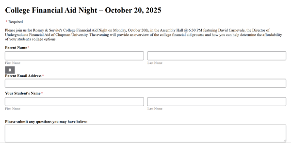 On Monday, Oct. 20, Rosary is hosting a college financial aid night in the Assembly Hall at 6:30 p.m. This is a joint event with Servite, and it will feature Chapman University’s Director of Undergraduate Financial Aid, David Carnevale. The night aims to “provide an overview of the college financial aid process and how you can help determine the affordability of your student’s college options,” according to this week’s Royal Review. This is a great opportunity to get a better understanding of how college financial aid can affect your ability to attend different colleges on your list.